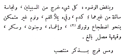 Translation Commentary Hypothetical Case: A person who is pricked with a pin or who experiences a paper cut such that blood does not flow beyond the border of the wound retains his state of wudu. Hypothetical Case: If a person inserts his finger into his nose and removes it to reveal a stain of blood on his finger that does not flow, then the wudu is not nullified. Hypothetical Case: Squeezing a boil or pimple such that blood or pus flows from it nullifies the wudu. Hypothetical Case: If blood oozes from a wound and is repeatedly dabbed with a cloth then one should contemplate whether or not the blood would have actually flowed from the wound had it not been dabbed. If so, then the wudu is nullified. Hypothetical Case: An individual notices blood in his saliva after brushing his teeth. If the blood is equal to or more than the saliva, and the saliva is red in color, then the wudu breaks. Hypothetical Case: A mouthful of vomit breaks the wudu. If it is less than a mouthful, the wudu remains intact. If a person vomits phlegm only, irrespective of the amount, the wudu does not break. If a blood which is thin and flowing is present in the vomit then the wudu is nullified even if the vomit is less than a mouthful. Hypothetical Case: The flow of tears from painful, pink eyes breaks the wudu. Hypothetical Case: A medical device that enters the rectal tract (for example a colon scope) or urinary tract (for example a Folley catheter) renders the wudu invalid upon its removal. Deep sleep and fainting invalidate the wudu because of the likelihood of wind passing from the rectum as it sphincter relaxes. Deep sleep is defined as that which occurs while lying down or reclining such that were support removed the person would fall. Insanity and intoxication are included because of the loss of awareness as to whether or not wind may have passed. Hypothetical Case: If a person falls asleep while sitting or standing in prayer, his wudu will not break. If he falls asleep while in prostration, his wudu breaks. Hypothetical Case: If a person falls asleep with his buttocks firmly planted on the floor, with reclining against something, he wudu does not break. Hypothetical Case: If a person sways from side to side while sitting, without falling, then his wudu does not break. Spiritual Dimension: Note the inclusion of intoxication in this list. The scholars of fiqh were careful not to exclude those who posses habits which might contradict other tenants of Islamic law. The errors such people commit do not remove them from the fold of Islam. Thus, the shari'ah remains applicable in their lives. The enormous grace of Allah (subhanahu wa ta'ala) prohibits His unveiling of many of our realities. When a weakness of a member of our community is exposed, we should be quick to conceal it and make excuses. Each of us has deep-rooted bad habits. Allah (subhanahu wa ta'ala) exposes these characteristics in some, while for others they remain hidden. None of us knows who sheds a tear of repentance in solitude. We seek His Infinite Mercy, and ask that he conceal our faults in both this world and the hereafter. The seventh nullifier of wudu is laughing in prayer. This not only invalidates the wudu, but the prayer as well. If such laughter occurs in a funeral prayer, neither the wudu nor the prayer are invalidated. Laughter is defined as that which is loud enough for someone else to hear. The final act that breaks wudu is the touching of an erect male private part with a woman's private part. This assumes that no barrier or cloth is present between these parts. If this progresses to insertion, a ritual bath becomes mandatory on both the man and the woman. Hypothetical