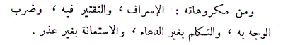 Translation Commentary The first of these is wasting water. Abdullah ibn 'Umar (ra) narrated that the Prophet (salla Allah 'alayhi wa sallam) once passed by Sa'd (ra) while he was making wudu and said, "What is this extravagance, Sa'd?" He questioned, "Is there extravagance in the use of water?" The Prophet (salla Allah 'alayhi wa sallam) replied, "Yes, even if you are at a flowing river." Spiritual Dimension: The Prophet (salla Allah 'alayhi wa sallam) shunned extravagance in wudu, an act commanded by the Quran and whose basis is preparation for worship. If such an act earns the displeasure of Allah (subhanahu wa ta'ala), imagine the results of our extravagance in the mundane matter of our daily lives. When economizing water, one must be careful not to use too little water. Enough water should be used to allow proper washing of each body part without wastage. The third of the disliked acts is splashing the face. Here the important principle is to be careful concerning residual water that flows off of the body, because it carries away minor sins. Additionally, one should give the wudu due care and not hurry through it. The fourth is speech other than supplications (du'a). This refers to speaking with others while making wudu. Purification is an act of worship, a fulfillment of a command of Allah (subhanahu wa ta'ala), and a means of purifying the body of minor sins. It behooves each individual to concentrate and focus on each individual action during this significant act. Finally,