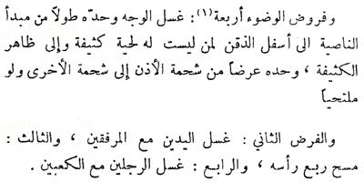 (once) your feet to the ankles." (Chapter 5, Verse 6) Leaving a fard is a sin, while denying a fard is an act of disbelief. That is, someone who doesn't perform wudu is a sinner, however, if someone outright denies wudu as part of Islam, he in essence has denied a verse of the Qur'an and therefore, enters a state of disbelief (kufr). The first of these integrals is washing the face once (once is fard while three times is sunnah). The face is defined linguistically as that area which is seen when facing someone. This includes the area between the earlobes in width and from the top of the forehead to bottom of the chin in length. For those areas of the face covered with hair such that the underlying skin is not visible, washing the overlying hair suffices. This includes eyebrows and the hair of a thick beard. If the beard is so thin that the underlying skin is visible, then the skin must be washed when making wudu. The second of the integrals is washing the arms to the elbows once. This includes the beginning of the fingertips to the elbow. Hypothetical Case: Special care should be taken when wearing nail polish as its creates a water resistant film which prohibits water from reaching the mandatory surfaces of the finger nails. The third